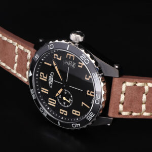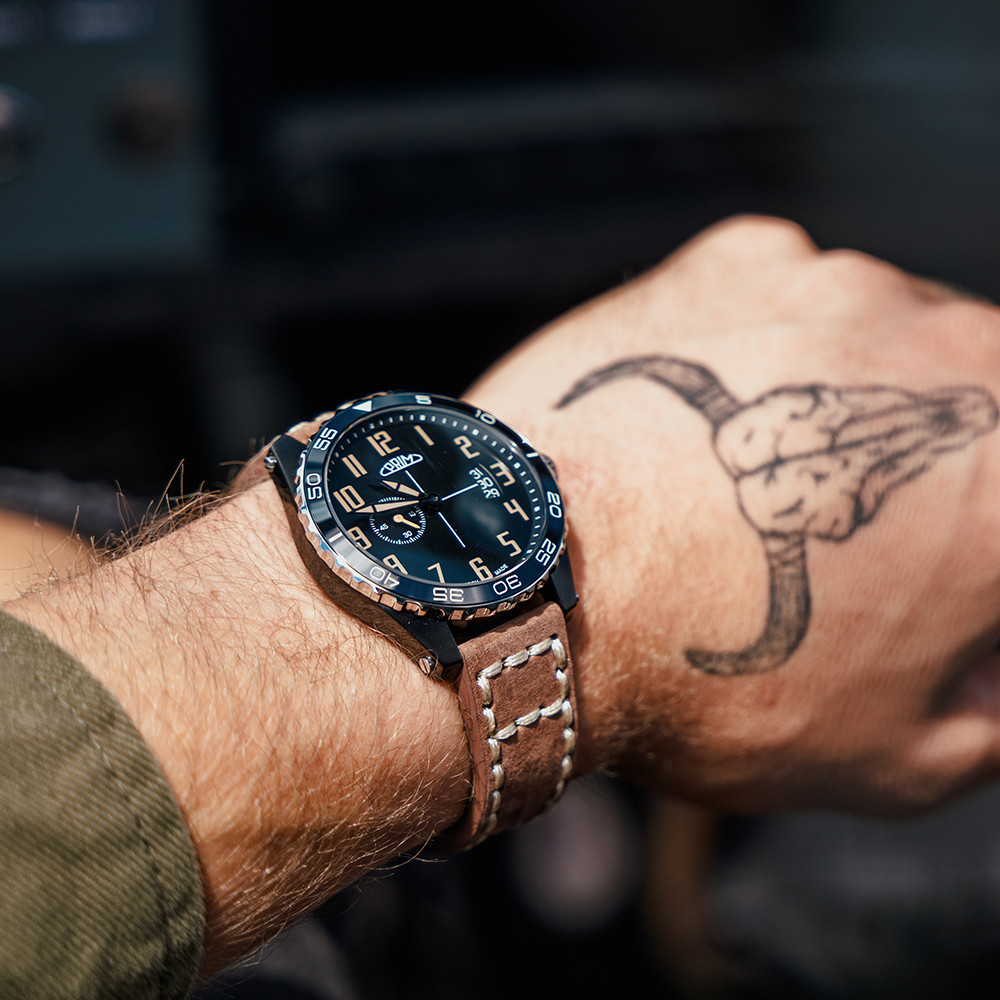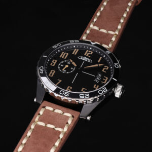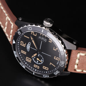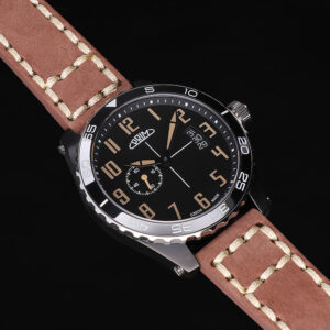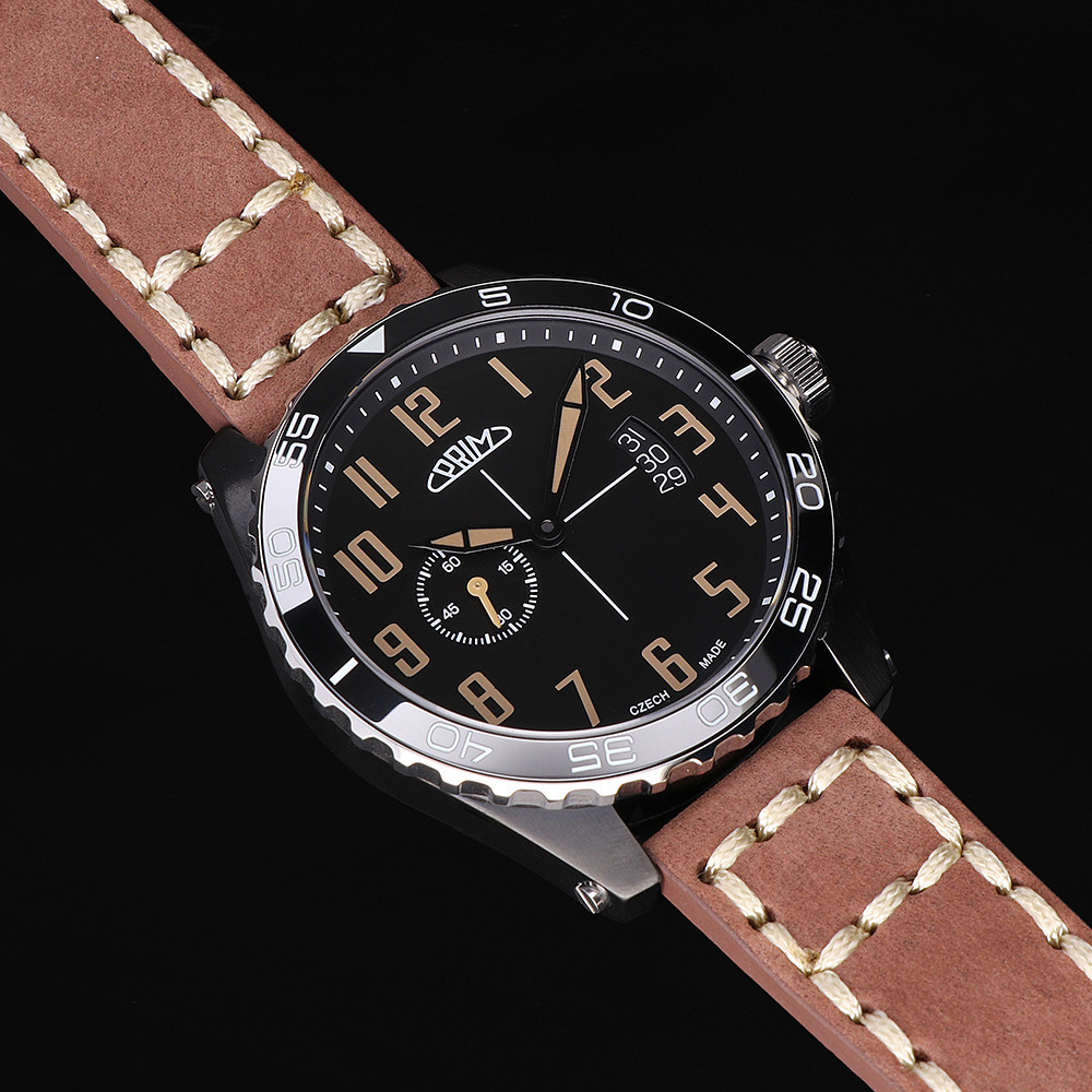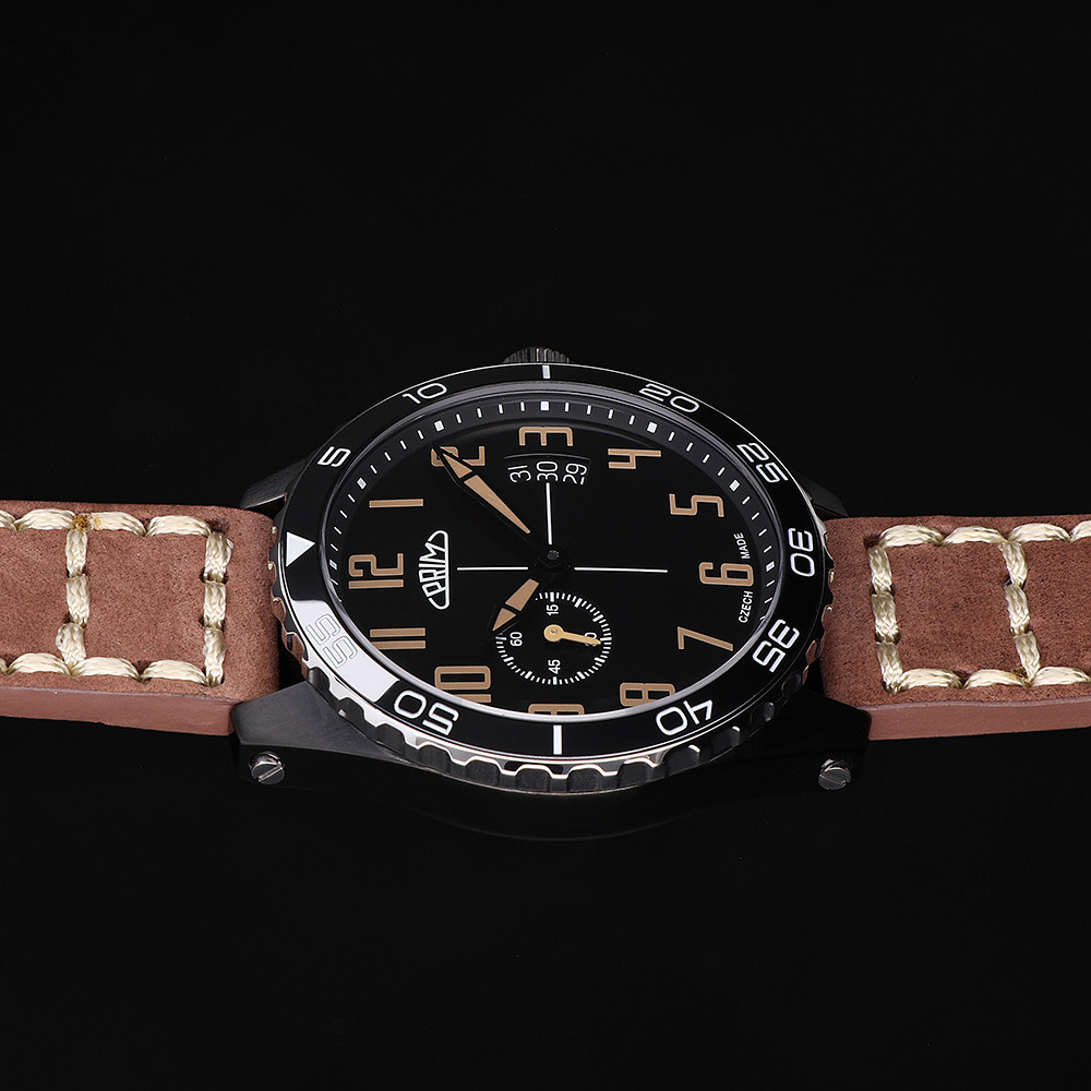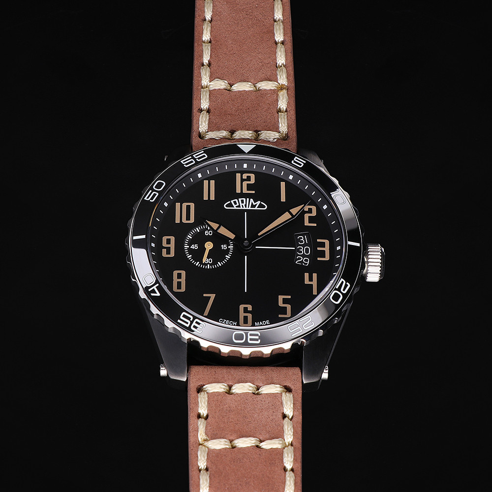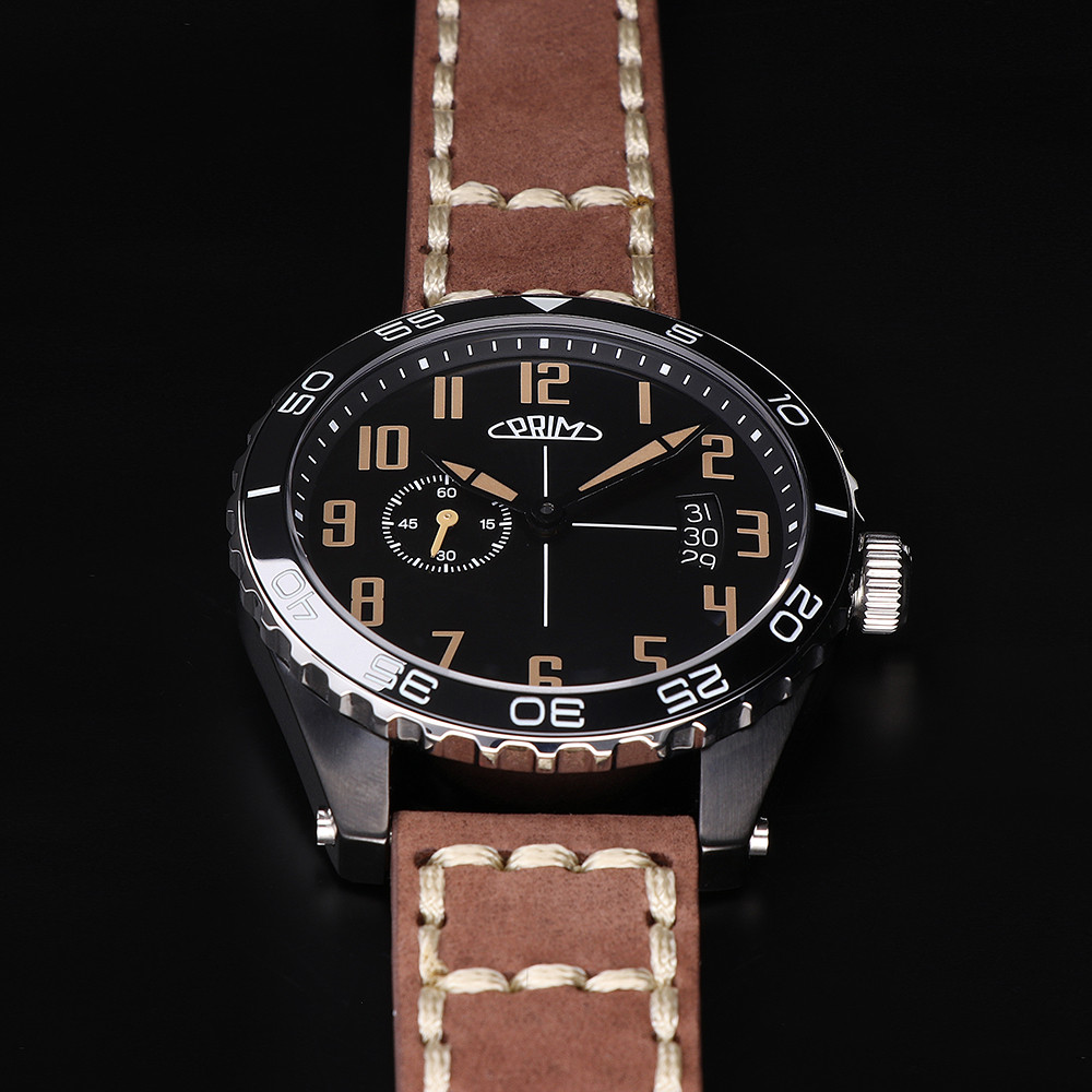 Limitovaná edice PRIM Aviator je osazena kvalitním švýcarským kalibrem Sellita SW 290-1. Tento elegantně sportovní model s výraznými luminiscenčními čísly a keramickou lunetou chrání nejdokonalejší antireflexní safírové sklíčko. Samotná keramická luneta je doplněna minutami s tradičním pilot trojúhelníkem a čárky připomínající umělý horizont. Limitovaná série 50 kusů v modro bílé verzi a 50 kusů černo hnědé.