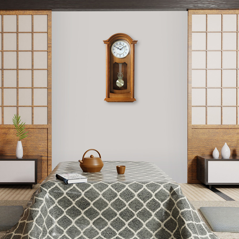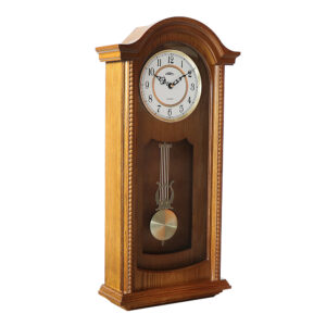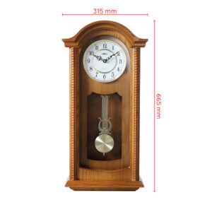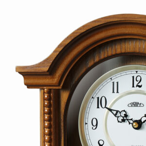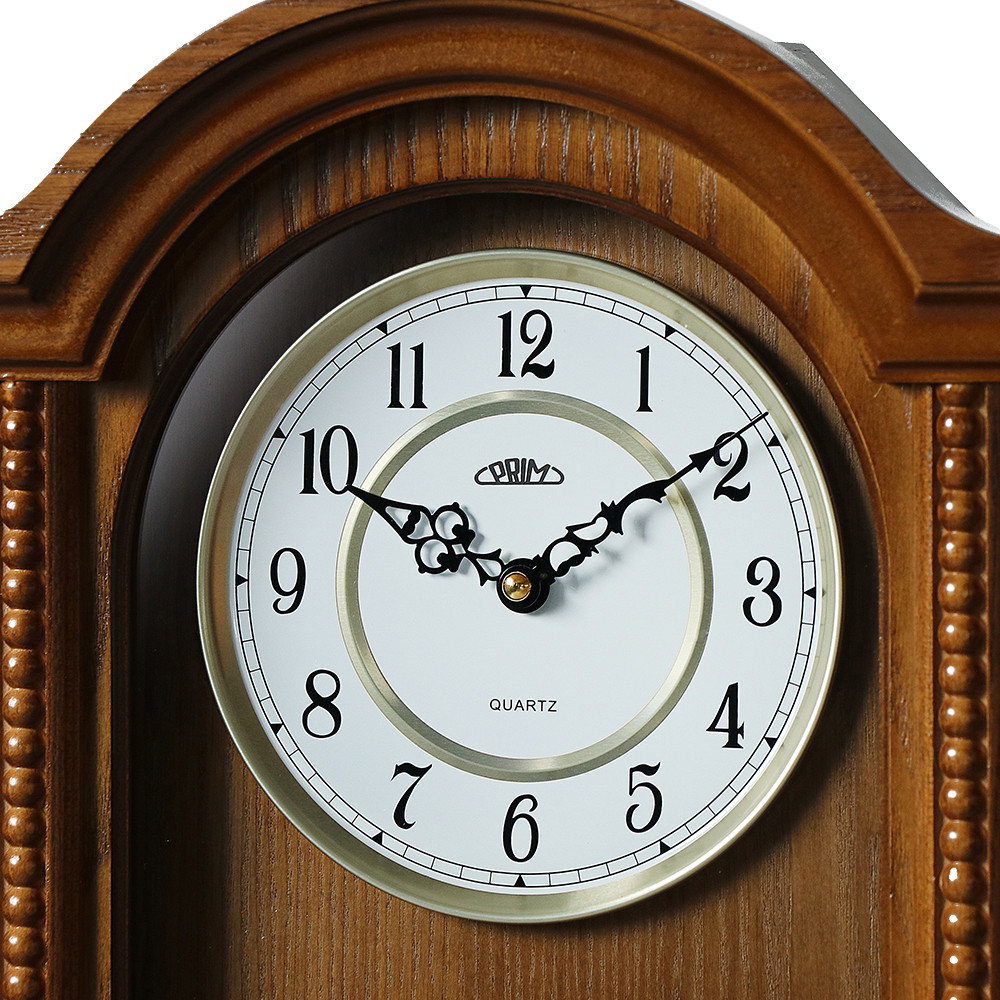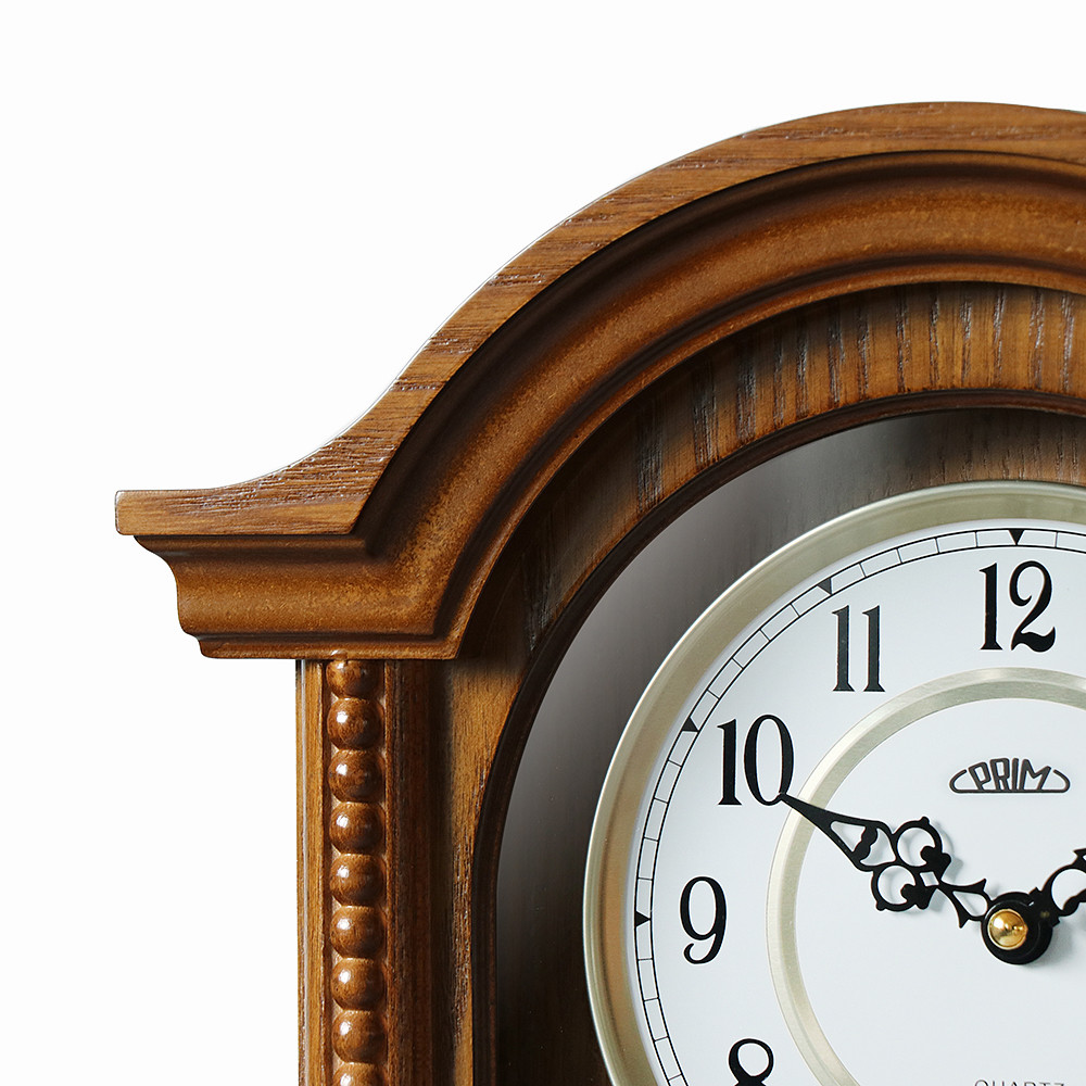 Dřevěné nástěnné hodiny PRIM Classic Pendulum v oblíbeném retro stylu s pozlaceným dekorativním kyvadlem. Kombinace dřeva, skla a kovu se výborně hodí do každého interiéru, ve kterém dokážou skvěle vyniknout. Hodiny upoutají elegantním kyvadlem a bílým ciferníkem s ozdobnými antickými ručičkami. Dřevěné rámy zkrášlují ozdobné vzory, jež těmto hodinám dodávají ještě silnější nádech klasiky. Pohyb kyvadla, které je u těchto hodin jen dekorativní, můžete v případě potřeby úplně zastavit bez obav z dopadu na jejich správnou funkci.