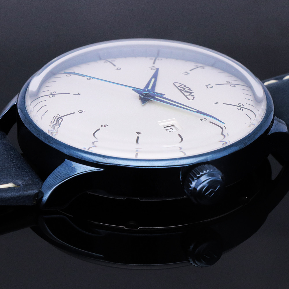 Společenské hodinky s automatickým natahováním s vlastním rotorem PRIM (strojek 8215). Na originálním designu hodinek pracovalo naše studio a vznikli tak hodinky s trendy designem a retro nádechem. Pouzdro je vyrobeno z kvalitní ušlechtilé nerezové oceli 316L (ve stříbrné, IP černé barvě a nově IP modré barvě), uzavřené nerezovým víčkem s průzorem. Klasický a čistý vzhled podtrhuje retro číselník s indexy a čísly. Na pozici 3 hodiny je vytvořeno okénko pro zobrazení datumu. Voděodolnost 5 ATM zaručuje odolnost proti vlhku při běžném použití. Tato modelová řada hodinek PRIM odpovídá náročným požadavkům dnešních zákazníků. Kvalitní retro kožený řemínek je zakončen designovou ocelovou sponou na trn. Tyto hodinky jsou dodávány v elegantní krabičce se záručním listem a návodem. Každý kus má přiděleno své výrobní číslo s popisem modelu.